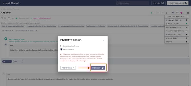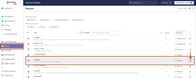 Im Bereich Themen befindet sich die vollständige Liste aller angelegten redaktionellen Themen (und KI Agenten) des Chatbots. Mit dem Klick auf den Stift hinter einem Thema öffnet sich die Bearbeitungsseite des Themas. Im Folgenden ist beschrieben, wie das Thema Angebot zu einem KI Agenten umgewandelt wird.