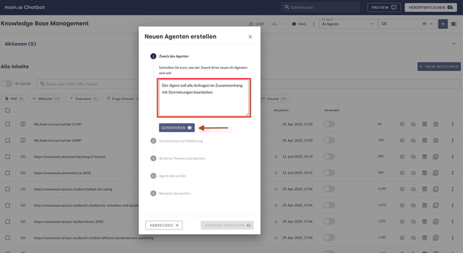 - Beschreibung des KI Agenten: Anschließend öffnet sich eine Eingabemaske, in welcher der KI Agent beschrieben und definiert wird. Im ersten Feld wird der Zweck des KI Agenten definiert. Ein Klick auf Generieren stößt den zweiten Schritt an, in dem die Eingabe gespeichert und validiert wird.