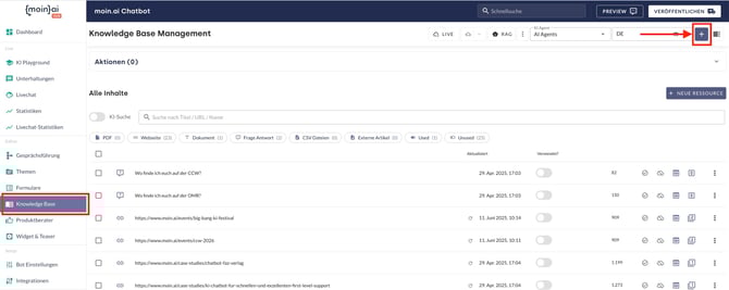 - KI Agent hinzufügen: Das Hinzufügen des KI Agenten erfolgt im Bereich Knowledge Base über das Plus-Symbol oben rechts.