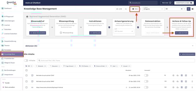 Unter dem Menüpunkt Knowledge Base öffnet sich über die Schaltfläche RAG die Ansicht der RAG Knowledge Base. Über Add Action in der Karte Actions & Follow-Up wird eine neue Eingabemaske geöffnet.