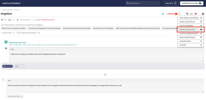 Im Editor des redaktionellen Themas erfolgt die Umstellung über das 3-Punkte Menü. Über den Button Agent erstellen erfolgt die Umwandlung.