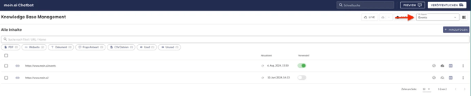 - Im Menüpunkt Knowledge Base auf den Button RAG klicken, um die RAG Management-Ansicht zu öffnen.