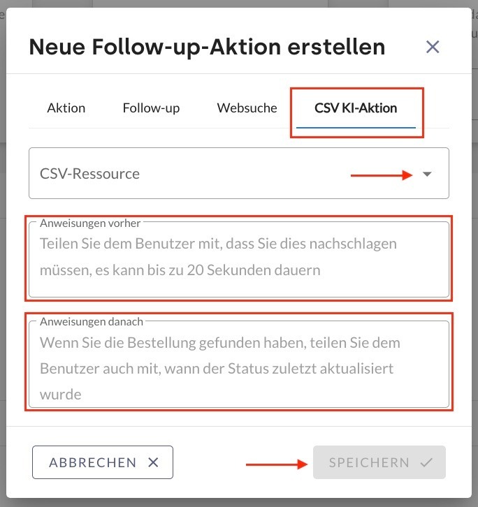 - Im Abschnitt CSV KI-Aktion erfolgt die Auswahl der CSV-Datei sowie die Definition, was der KI-Agent vor und nach der Antwort ausgeben soll.