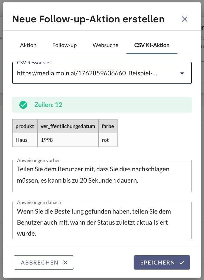 Die Funktion CSV KI-Aktion muss vor der Nutzung aktiviert werden. Das Customer Success Management Team unterstützt bei der Freischaltung.