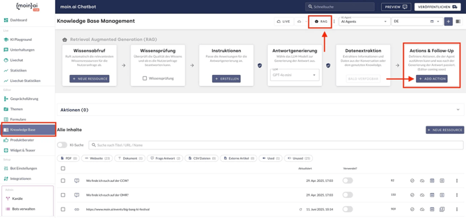 (1) Unter dem Menüpunkt Knowledge Base öffnet sich über die Schaltfläche RAG die Ansicht des RAG Management. Über Add Action in der Karte Actions & Follow-Up wird eine neue Eingabemaske zum Anlegen einer Aktion geöffnet.
