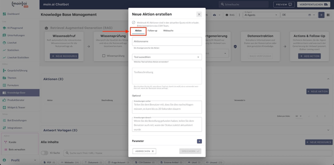 - Im Menüpunkt Knowledge Base wird über öffnet sich über die Schaltfläche RAG die Ansicht des RAG Management. Über Add Action in der Karte Actions & Follow-Up wird eine neue Eingabemaske geöffnet.
