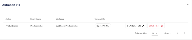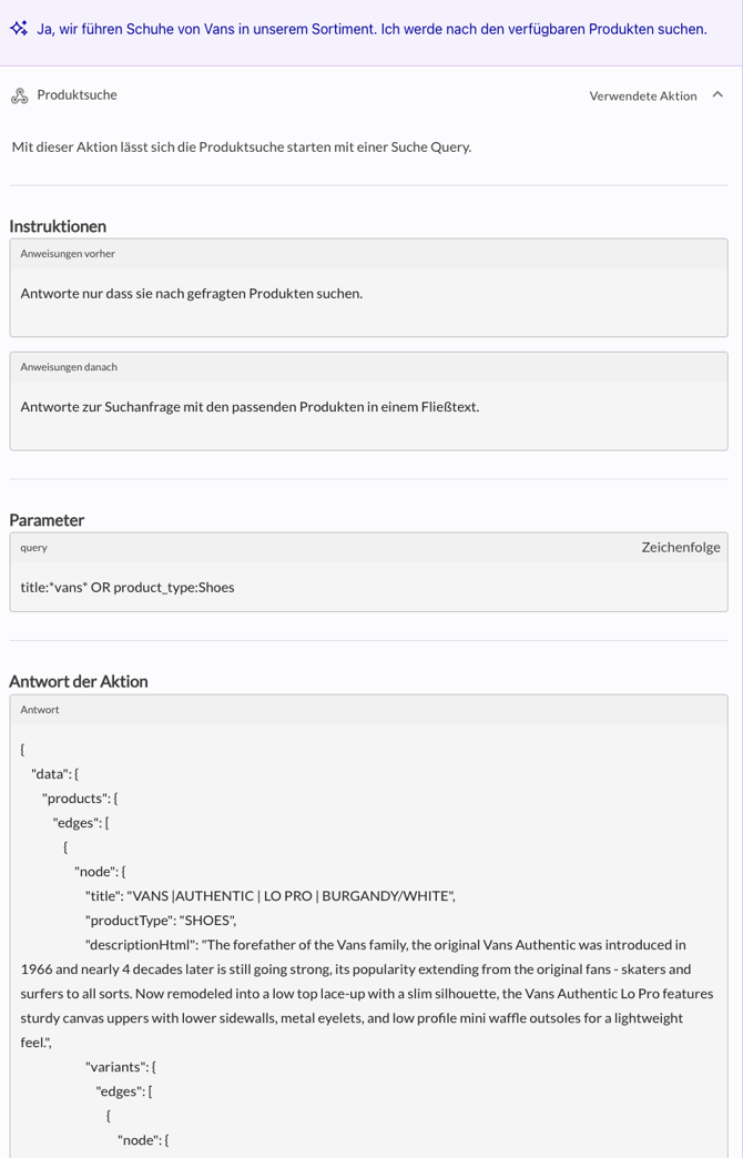 - Mit einem Klick auf den Pfeil neben Verwendete Aktion können Details wie Parameter und Produktdaten eingesehen und angepasst werden, um die AI Action zu optimieren.