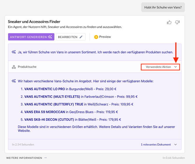 - Ist der Agent aktiv, kann er im KI Playground getestet werden. Mit einem Klick auf Antwort generieren führt die AI Action eine Produktsuche passend zur Nutzeranfrage durch.