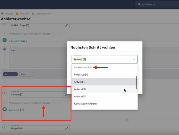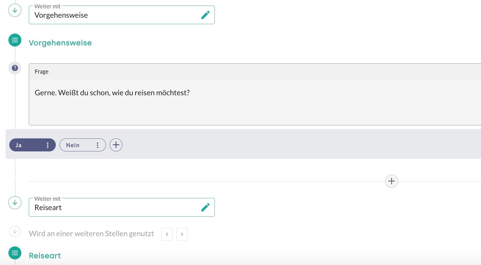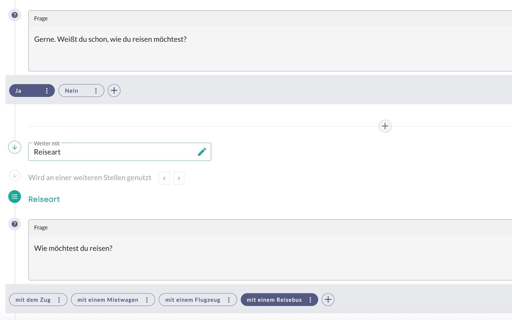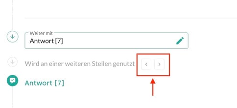 Möglich ist das Verweisen auf bestehende Antwortstränge, z.B. auf einen Multiple-Choice-Pfad oder eine Ja/Nein-Frage, die an anderer Stelle in der Antwort verwendet werden.