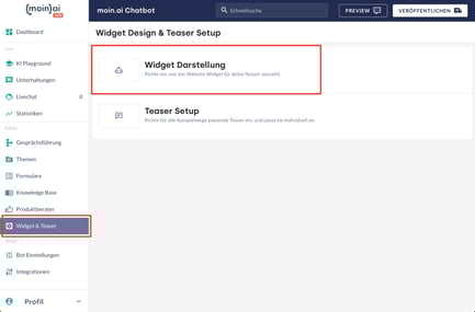 - Über den Menüpunkt Widget & Teaser den Bereich Widget Darstellung öffnen.