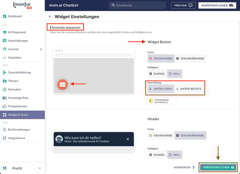 - Im Abschnitt Elemente anpassen kann die Ausrichtung des Widgets auf der Webseite bestimmt werden. Im Bereich Widget Button wird mit der Auswahl der Buttons unten links und unten rechts die Ausrichtung des Widgets festgelegt. Links neben den Buttons passt sich die Vorschau entsprechend der Auswahl automatisch an.