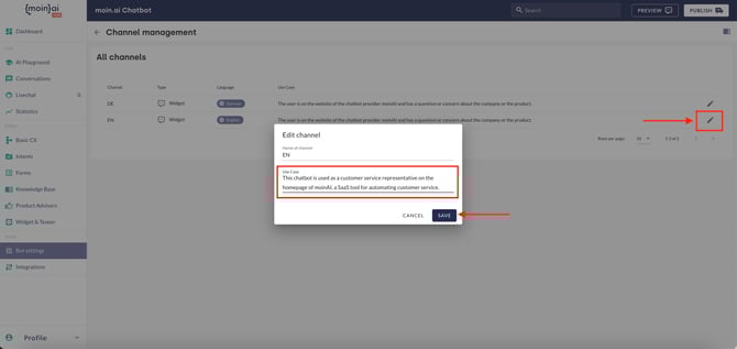 The use case is defined in the menu item Bot Settings → Channel Management → pencil icon → Use Case. Click Save to apply the entry.