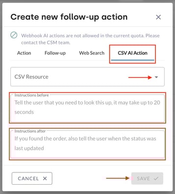 - In the CSV AI Action section, select the CSV file and define what the AI agent should output before and after the response.