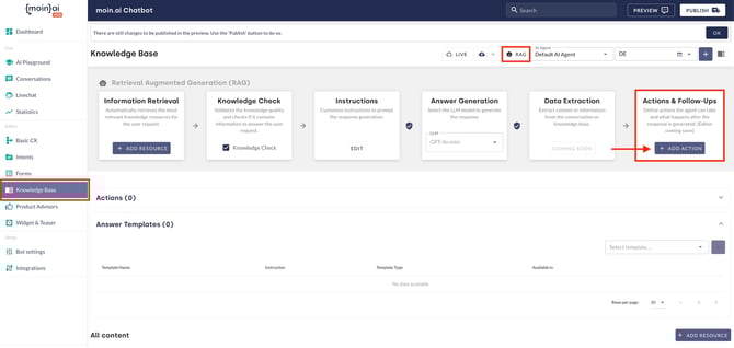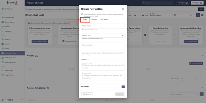 (1) Under the Knowledge Base menu item, click the RAG button to open the RAG Management view. Click Add Action in the Actions & Follow-Up card to open a new input mask for creating an action.