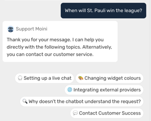 The Quick Reply for forwarding the request to customer service is added to the last position and can be titled with “Customer Service” (customer service, service team, experts or similar) or with 'Forward Message' or 'Send message'. To emphasise the possibility of takeover, a 💬 speech bubble emoji can be used in the title of the Quick Reply.