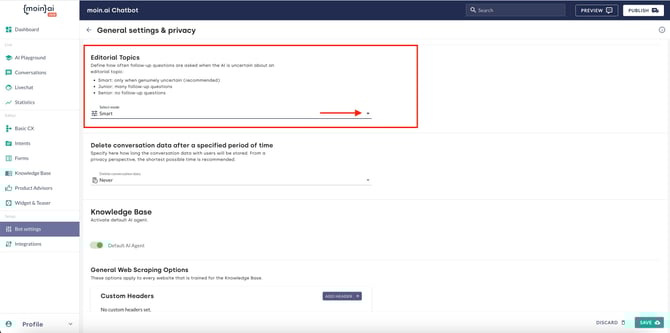 Confirmation questions are used when the AI chatbot is unsure whether the intended topic is actually meant. It only occurs in editorial topics. The following options are available for adjusting the behaviour and frequency of queries: