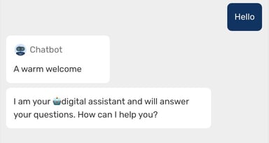 The chatbot welcomes the user and clearly states that a digital assistant is answering the queries. This is shown using the 🤖 robot emoji. It is also indicated which topic the digital assistant can help with. Finally, the user is asked to send their requests.