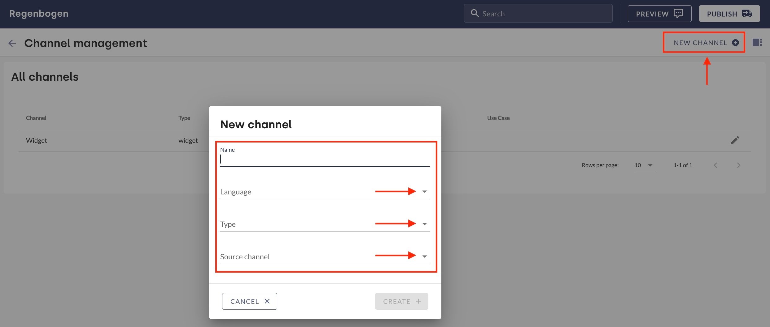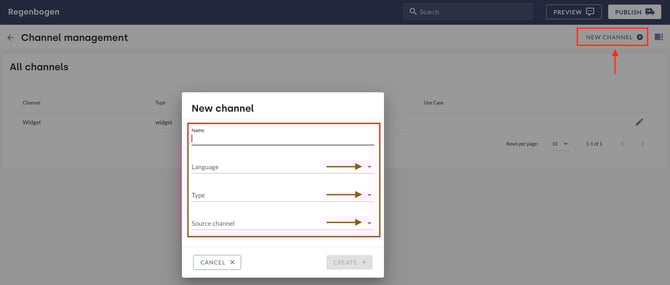 By default, only one channel in German is created in the chatbot. Additional channels can be added to support multiple languages or to use different playback channels. The following describes how to create a new channel.