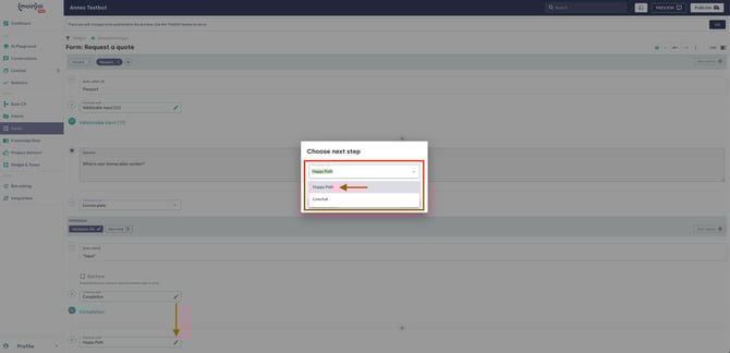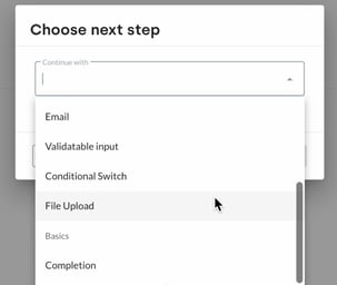 - Click on the pencil icon to open the Choose next step window. Here, the conversational design element can be selected.