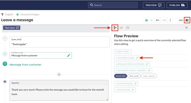 - In the Flow Preview, the names of the sections can be changed by clicking on the pencil icon.