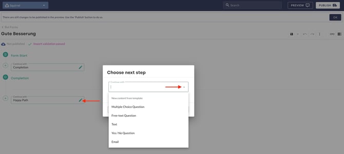 - After opening the form editor in the form overview using the pencil icon, select the first conversational design element in the green selection field Continue with.