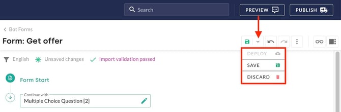 The form can be saved, discarded and published using the arrow next to the diskette icon. Clicking on the disk icon itself also saves the form.