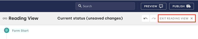 Reading mode allows you to view the form in a continuous flow without edit buttons. The mode is entered by clicking on the glasses icon and exited by clicking the Exit reading view button.