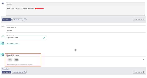 The file upload function allows files to be uploaded to the AI chatbot. File uploads can include, for example, uploading a document (ID card, receipts, etc.). Permitted file types are defined using the drop-down menu under Permitted file types.