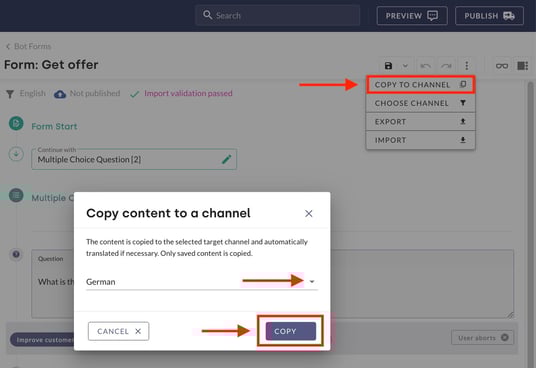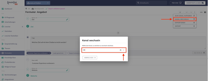 The Copy to channel function allows you to copy a form to another channel of the AI chatbot. After selecting the option, a window opens for selecting the target channel. The copy is created by clicking on the Copy button.