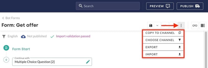 You can open a form via the Forms menu item and edit it using the pencil icon. The three-dot menu offers the following options: Copy to channel, Switch channel, Export and Import. These functions are described below.