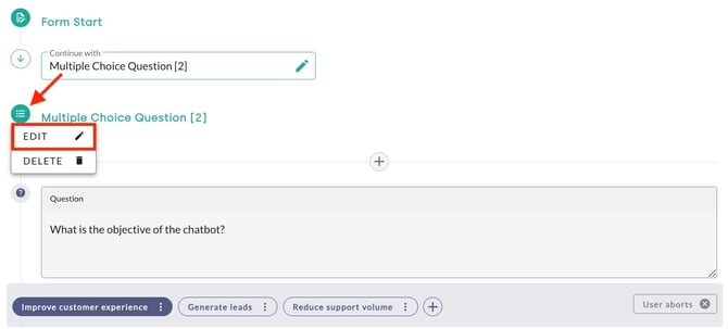 By clicking on the 3-dot menu next to the quick reply buttons, you can edit the name of the button and the order in which the buttons appear. It is also possible to delete the response.