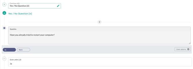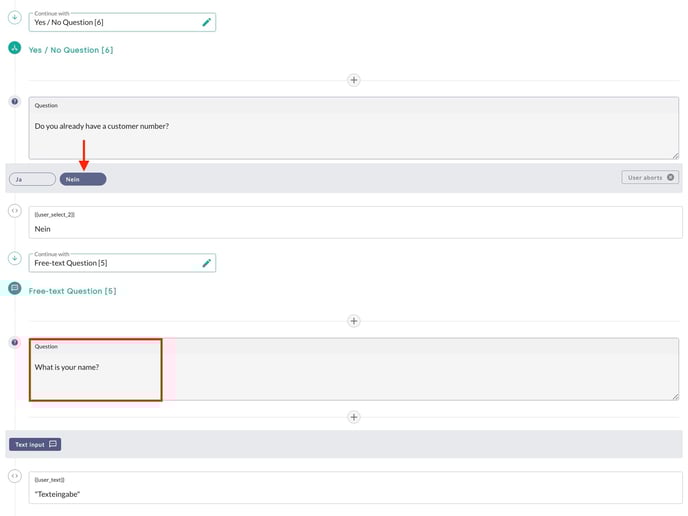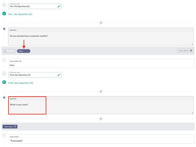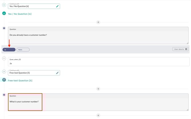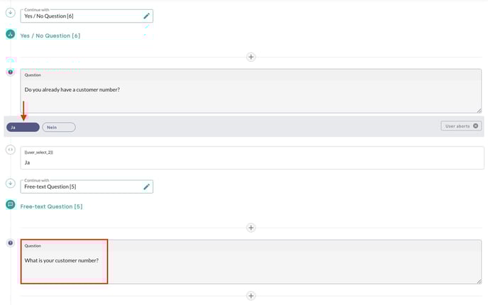 In the following example, a query for entering the customer number is implemented. The aim is to assign enquiries to existing customer data or processes. If the Yes option is selected, the customer number is requested. If No is selected, the name is requested instead.