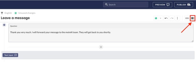 Simple text entry allows information to be provided without requiring a response from the user. Unlike questions with free text answers, yes/no buttons or multiple-choice selections, only a text block appears here, with no option to respond. The conversational design element Text is selected for this purpose.