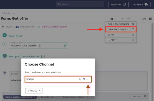 The Switch Channel function allows you to move a form from one channel to another. Attention: The move takes place immediately after clicking choose channel and selecting the destination. The change can be reversed in the same way.