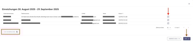 - Leads: Overview of forms with entries in the respective sections. Clicking on the rectangle with arrow icon allows you to view the entire form. The CSV Download button allows you to download all information as a CSV file.