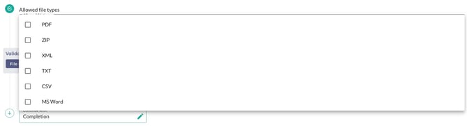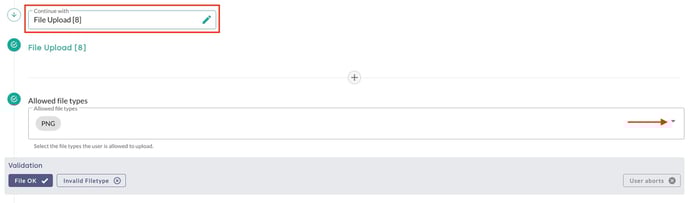 To prevent unusable file types from being uploaded, the selection should be defined here. If an unauthorised file type is uploaded, users will be prompted to upload the file again. Only when the authorised file type has been uploaded can the form be continued.