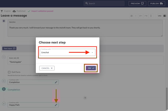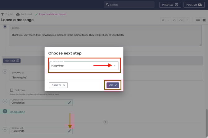 - When Happy Path is selected and confirmed with Ok, this follow-up option is applied and played out in the AI chatbot.