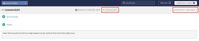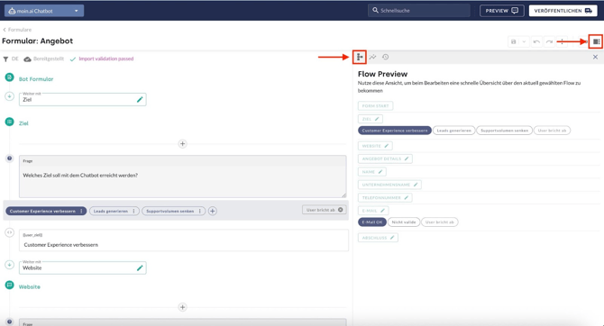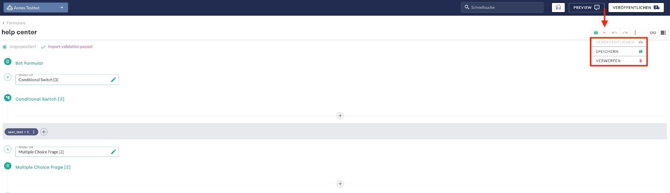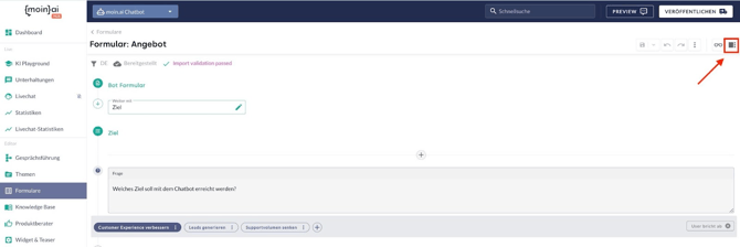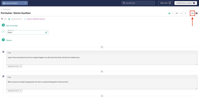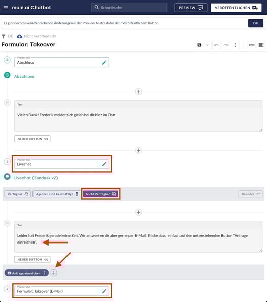 Forms in the AI chatbot collect user data in a structured manner. Forwarding the data collected in this way to the responsible service employees then speeds up the processing of enquiries. Forms are customisable and a prerequisite for transfer to human employees (human takeover). The form editor allows you to create and edit forms, including all conversation steps and links (e.g. webhooks). All entries, including buttons for multiple-choice or other conversational design elements, are stored in context.