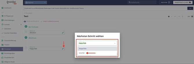 A context must be set for each response so that the form can be submitted, e.g. by email. This step is handled by moinAI, as is the linking of forms.