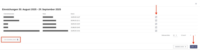 - Submissions: List of all fully completed forms. Clicking on the rectangle with the arrow opens the complete form. The CSV Download button allows you to download all information as a CSV file.