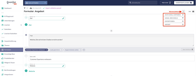 You can open a form via the Forms menu item and edit it using the pencil icon. The three-dot menu offers the following options: Switch channel, Copy to channel, Export and Import. These functions are described below.