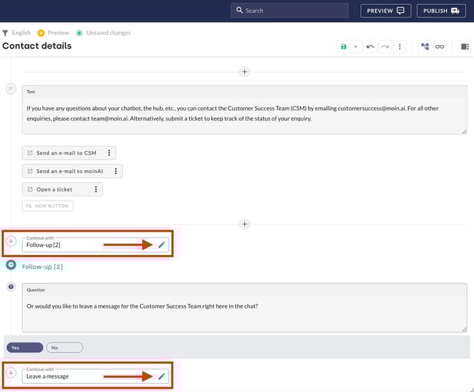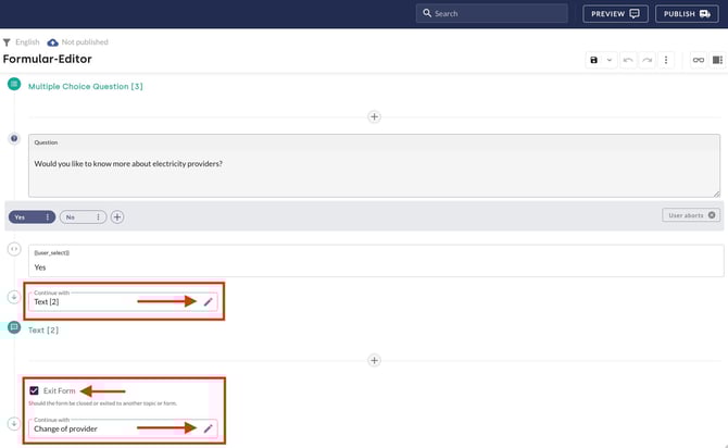 Forms can also be easily linked to topics. To do this, a follow-up must be set as the final element at the end of the topic.