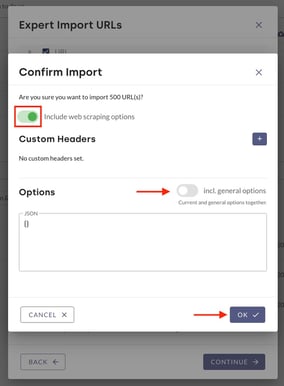 - Optional: Web scraping rules can be stored by activating the Include web scraping options toggle. These rules are applied to all URLs to be imported. Global settings can also be activated via incl. general options.