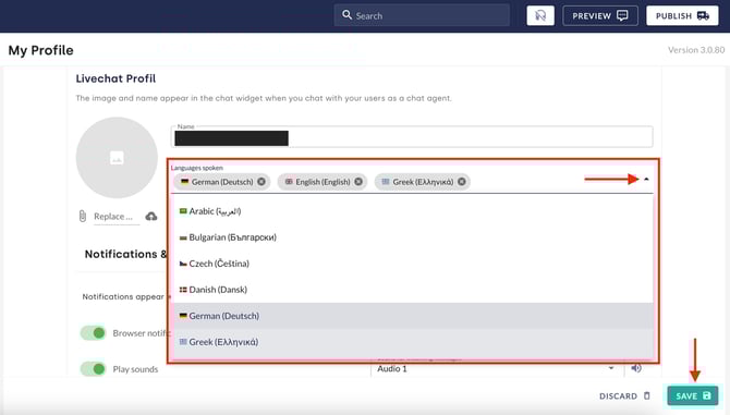In the Livechat Profile section, enter your language skills in the Languages Spoken field.