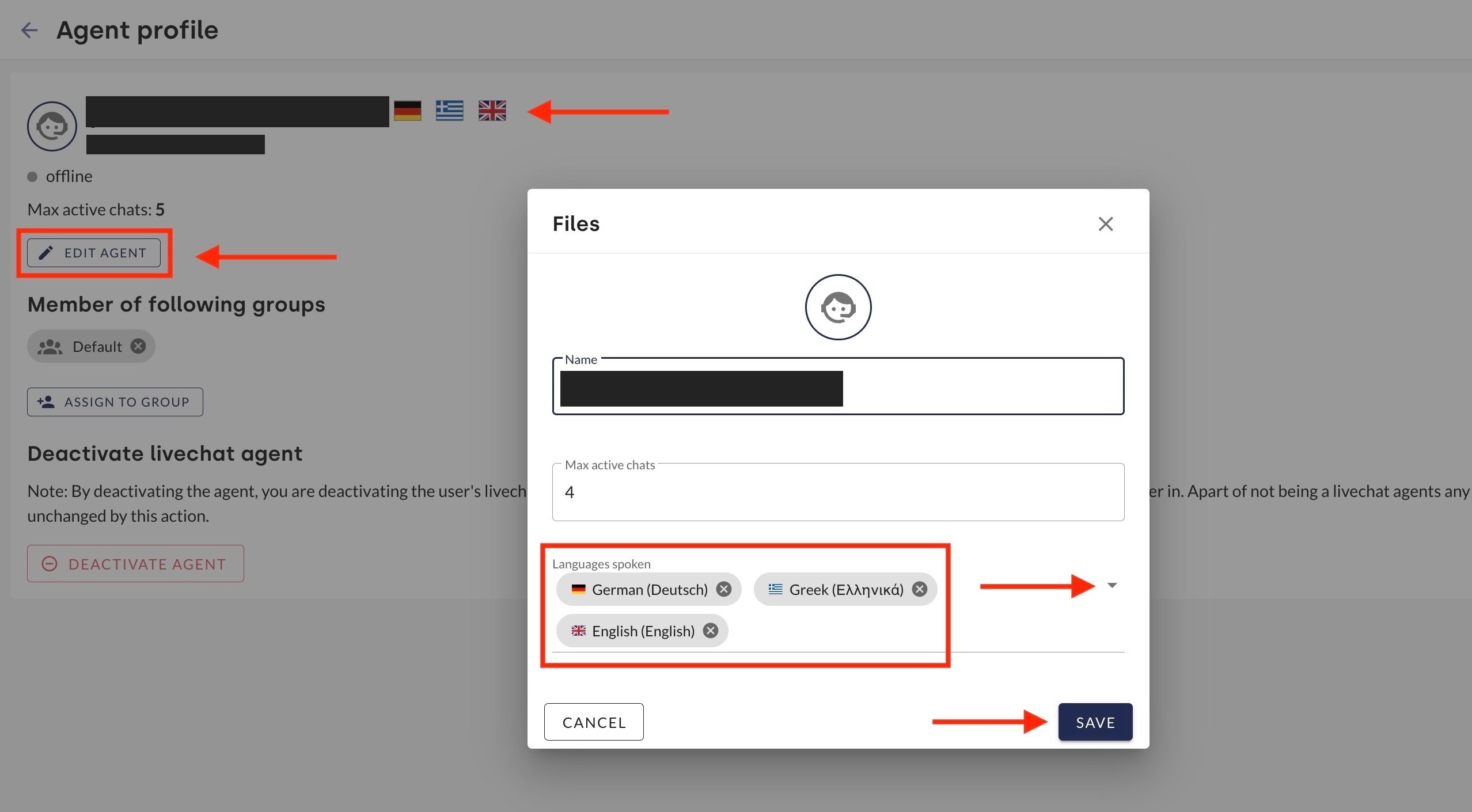 Via Edit Agent, enter the spoken languages or select from the list of available languages using the down arrow.
