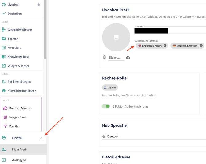 Alternatively, the agent can select the spoken languages via profile → my profile → live chat profile.