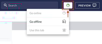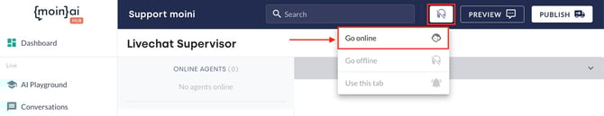 Live chat agents are offline by default. The agents can be set to online via the crossed-out headphones in the header of the hub.