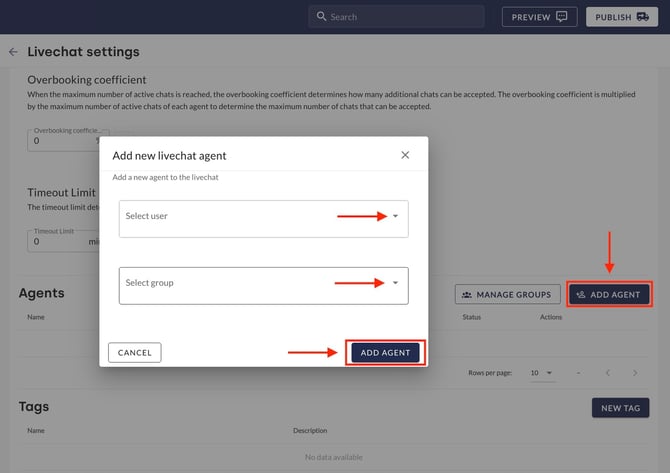 Click on Add Agent to select an existing user of the chatbot that should function as a live chat agent.