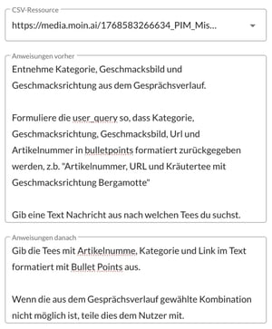 The tea advisor is a good example of how structured, AI-supported product advice works. The aim is to translate general user requests into precise product recommendations based on a comprehensive database stored in the knowledge base.