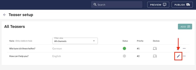 - When clicking on Create teaser, the teaser appears in the All Teasers list. New teasers are deactivated by default and have a grey circle in the Status column. We recommend to only activate the teaser after it was set up in the editing area.